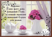 Картина формату А4 (32х22 см). Яскравий малюнок з біблійним текстом. ХРИСТОС - ГЛАВА ЦЬОГО ДОМУ, НЕВИДИМИЙ ГІСТЬ ЗА КОЖНОЮ ТРАПЕЗОЮ І МОВЧАЗНИЙ СЛУХАЧ УСІХ РОЗМОВ . Рамка ...