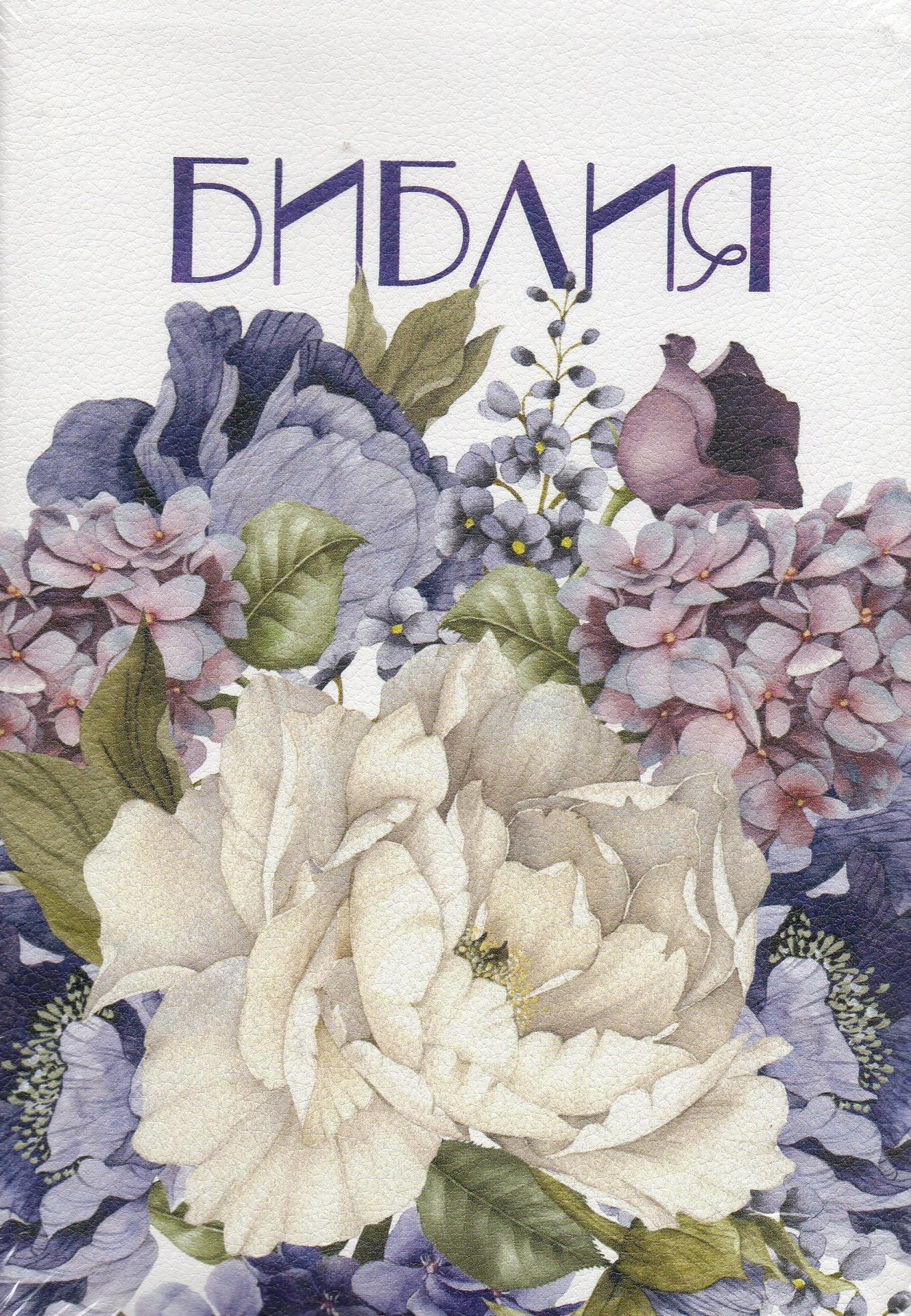 Біблія біла з фіолетовими квітами, зріз з фіолетовим малюнком та індексами. Паралельні місця всередині. Синодальний переклад.