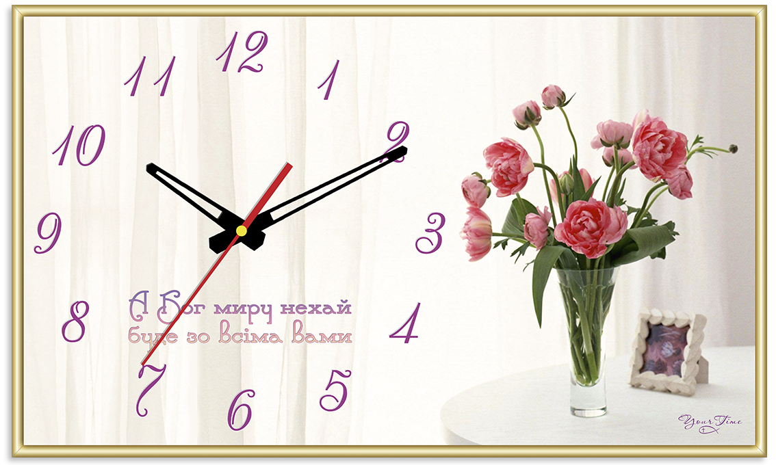 Інтер'єрні кварцові годинники - оригінальні, авторські часи, ручної роботи. На часах зображено вазон з квітами та напис "Бог же світу нехай буде з усіма вами!". Корпус годинників виготовлений з алюмінієвого профілю nielsen, циферблат виготовлений із шліфованого та полірованого стекла, високої якості. Фарби та всі матеріали стійкі до сонячного світла. Характеристика: - точний кварцовий безшумний механізм з плавним ходом - відкритий циферблат - центральна секундна стрілка - матеріал корпусу - скло - точність ходу +/- 0,5 секунд на добу