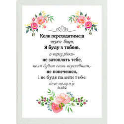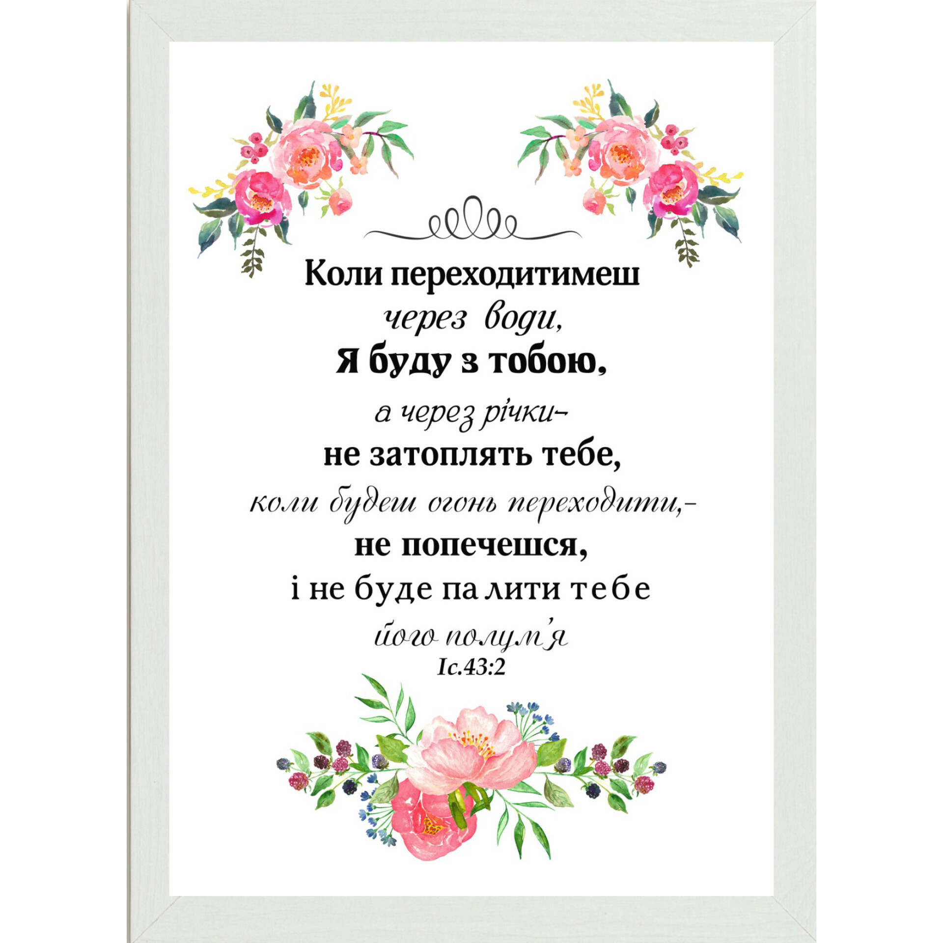 Картина формату А4 (32х22 см). Яскравий малюнок з біблійним текстом: Книга пророка Ісаї 43:2. Рамка може відрізнятися в залежності від партії. Українською мовою. Оргскло. Положення: на стіну.