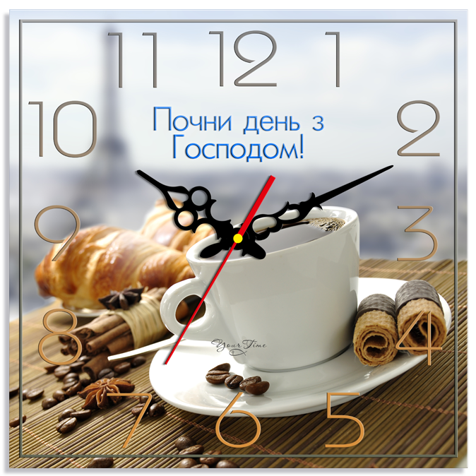 Інтер'єрний кварцовий часник - оригінальний, авторський часник, ручної роботи. На часах зображено чашку з кавою на фоні Ейфелевої вежі з написом "Почни день з Господом". Корпус годинників виготовлений із шліфованого та полірованого стекла, високої якості, з ідеальним ограновуванням країв. Фарби та всі матеріали стійкі до сонячного світла. Характеристика: - точний кварцовий безшумний механізм з плавним ходом - відкритий циферблат - центральна секундна стрілка - матеріал корпусу - скло - точність ходу +/- 0,5 секунд на добу