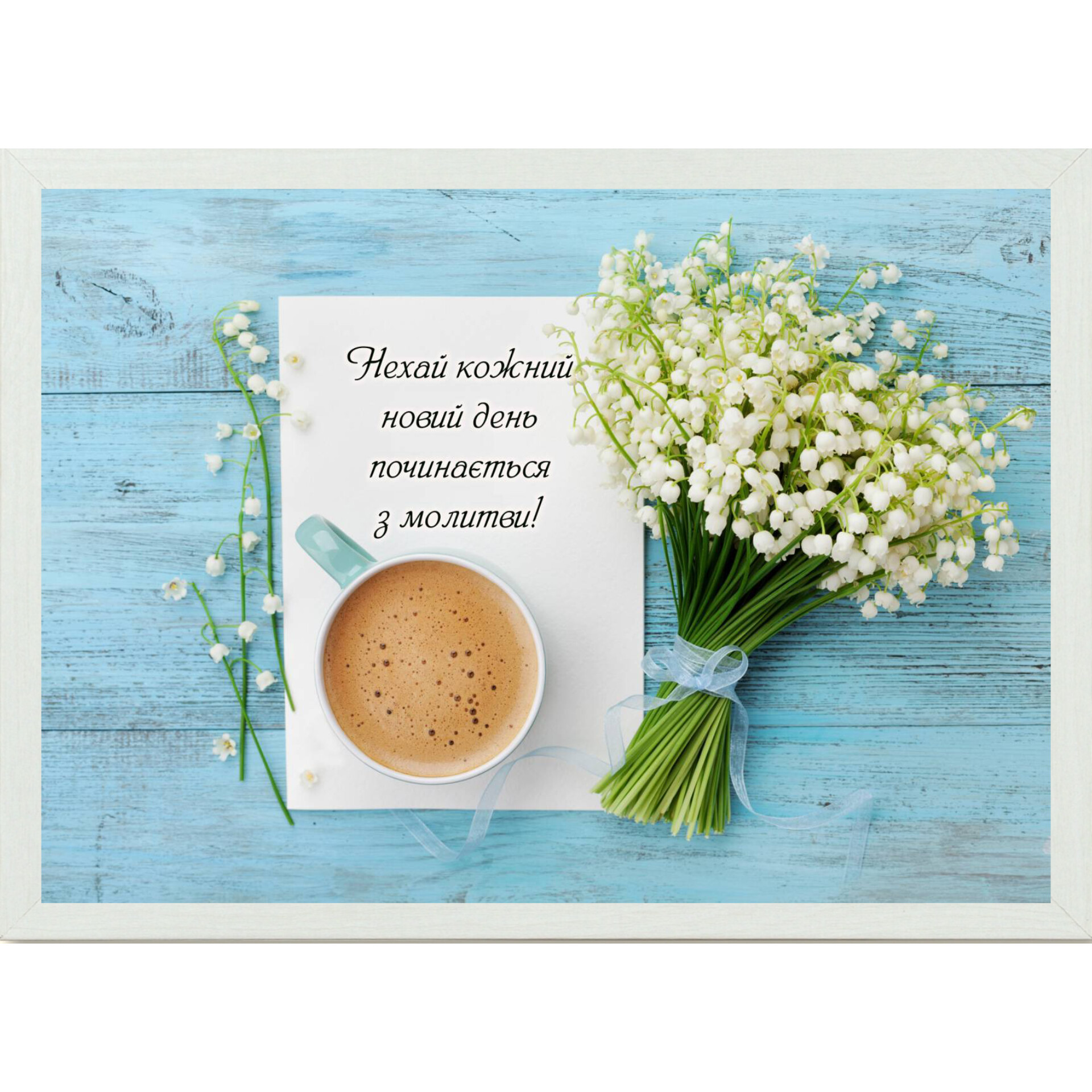 Картина формату А4 (32х22 см). Яскравий малюнок з текстом: Нехай кожен новий день починається з молитви. Рамка може відрізнятися в залежності від партії. Українською мовою. Оргскло. Положення: на стіну.