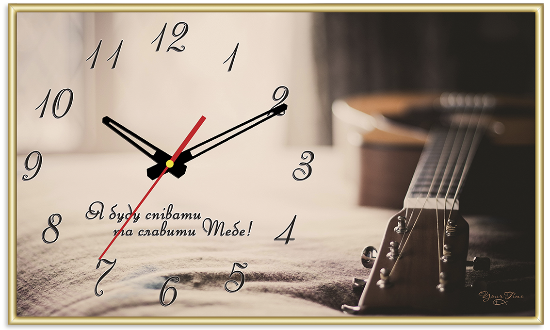Інтер'єрні кварцові годинники - оригінальні, авторські часи, ручної роботи. На часах зображена гітара та напис "Я буду співати та славити Тобі!". Корпус годинників виготовлений з алюмінієвого профілю nielsen, циферблат виготовлений із шліфованого та полірованого стекла, високої якості. Фарби та всі матеріали стійкі до сонячного світла. Характеристика: - точний кварцовий безшумний механізм з плавним ходом - відкритий циферблат - центральна секундна стрілка - матеріал корпусу - скло - точність ходу +/- 0,5 секунд на добу